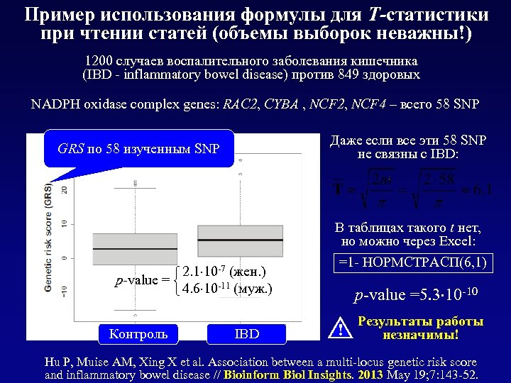 Пример использования формулы для Т-статистики при чтении статей (объемы выборок неважны!) 1200 случаев воспалительного заболевания кишечника (IBD - inflammatory bowel disease) против 849 здоровых NADPH oxidase complex genes: RAC 2, CYBA , NCF 2, NCF 4 – всего 58 SNP Даже если все эти 58 SNP не связны с IBD: GRS по 58 изученным SNP В таблицах такого t нет, но можно через Excel: 2. 1 10 -7 (жен. ) p-value = 4. 6 10 -11 (муж. ) Контроль IBD =1 - НОРМСТРАСП(6, 1) p-value =5. 3 10 -10 ! Результаты работы незначимы! Hu P, Muise AM, Xing X et al. Association between a multi-locus genetic risk score and inflammatory bowel disease // Bioinform Biol Insights. 2013 May 19; 7: 143 -52.