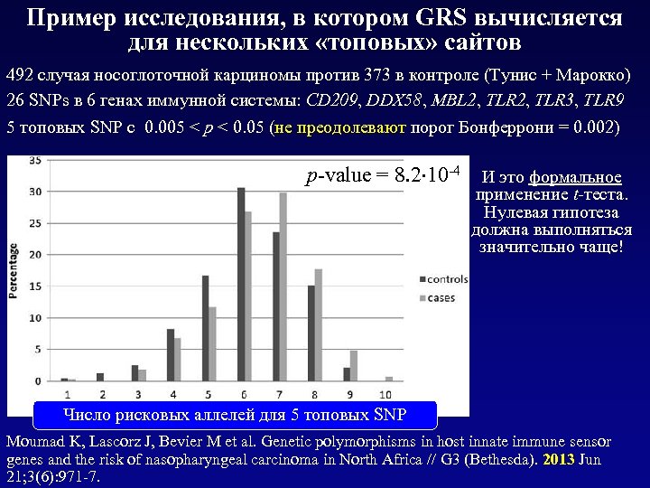 Пример исследования, в котором GRS вычисляется для нескольких «топовых» сайтов 492 случая носоглоточной карциномы против 373 в контроле (Тунис + Марокко) 26 SNPs в 6 генах иммунной системы: CD 209, DDX 58, MBL 2, TLR 3, TLR 9 5 топовых SNP с 0. 005 < p < 0. 05 (не преодолевают порог Бонферрони = 0. 002) p-value = 8. 2 10 -4 И это формальное применение t-теста. Нулевая гипотеза должна выполняться значительно чаще! Число рисковых аллелей для 5 топовых SNP Moumad K, Lascorz J, Bevier M et al. Genetic polymorphisms in host innate immune sensor genes and the risk of nasopharyngeal carcinoma in North Africa // G 3 (Bethesda). 2013 Jun 21; 3(6): 971 -7.