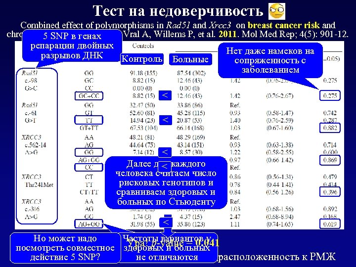 Тест на недоверчивость Combined effect of polymorphisms in Rad 51 and Xrcc 3 on breast cancer risk and chromosomal radiosensitivity. Vral A, Willems P, et al. 2011. Mol Med Rep; 4(5): 901 -12. 5 SNP в генах репарации двойных разрывов ДНК Контроль Больные Нет даже намеков на сопряженность с заболеванием < < < Далее для каждого < человека считаем число рисковых генотипов и сравниваем здоровых и больных по Стьюденту < Частоты вариантов у Но может надо «Рисковые» генотипы Ура! p-value = 0. 041 посмотреть совместное здоровых и больных (чаще у больных) Вывод: 5 SNP совокупно определяют предрасположенность к РМЖ не отличаются действие 5 SNP?