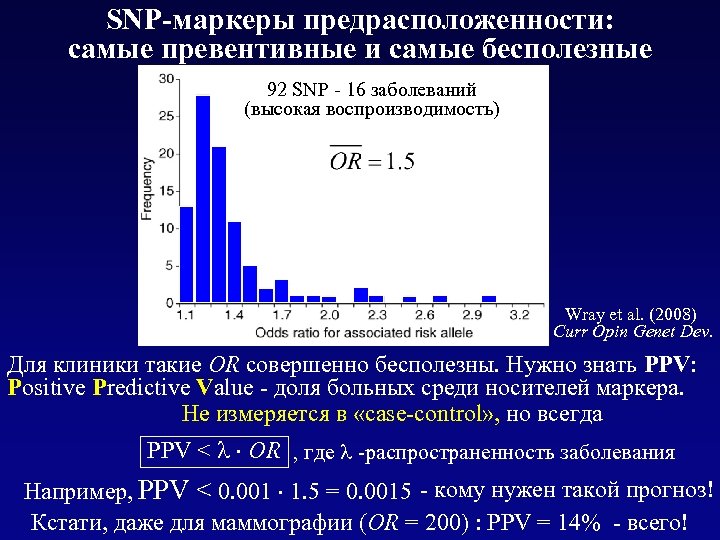 SNP-маркеры предрасположенности: самые превентивные и самые бесполезные 92 SNP - 16 заболеваний (высокая воспроизводимость) Wray et al. (2008) Curr Opin Genet Dev. Для клиники такие OR совершенно бесполезны. Нужно знать PPV: Positive Predictive Value - доля больных среди носителей маркера. Не измеряется в «case-control» , но всегда PPV < OR , где -распространенность заболевания Например, PPV < 0. 001 1. 5 = 0. 0015 - кому нужен такой прогноз! Кстати, даже для маммографии (OR = 200) : PPV = 14% - всего!
