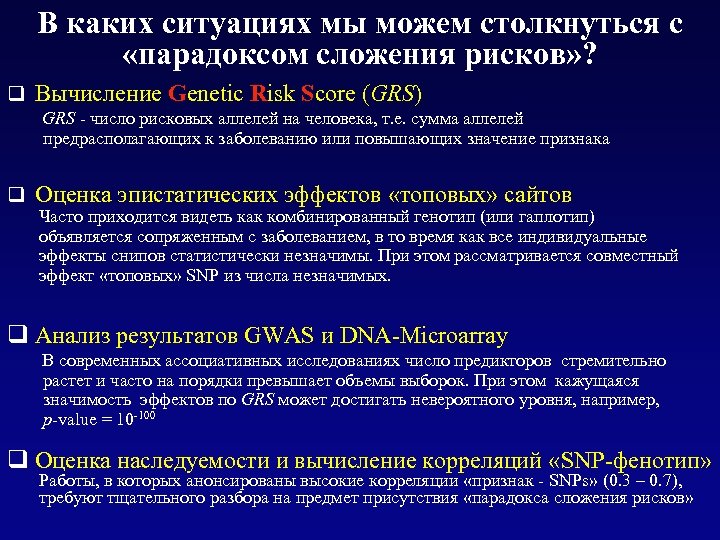 В каких ситуациях мы можем столкнуться с «парадоксом сложения рисков» ? q Вычисление Genetic Risk Score (GRS) GRS - число рисковых аллелей на человека, т. е. сумма аллелей предрасполагающих к заболеванию или повышающих значение признака q Оценка эпистатических эффектов «топовых» сайтов Часто приходится видеть как комбинированный генотип (или гаплотип) объявляется сопряженным с заболеванием, в то время как все индивидуальные эффекты снипов статистически незначимы. При этом рассматривается совместный эффект «топовых» SNP из числа незначимых. q Анализ результатов GWAS и DNA-Microarray В современных ассоциативных исследованиях число предикторов стремительно растет и часто на порядки превышает объемы выборок. При этом кажущаяся значимость эффектов по GRS может достигать невероятного уровня, например, p-value = 10 -100 q Оценка наследуемости и вычисление корреляций «SNP-фенотип» Работы, в которых анонсированы высокие корреляции «признак - SNPs» (0. 3 – 0. 7), требуют тщательного разбора на предмет присутствия «парадокса сложения рисков»