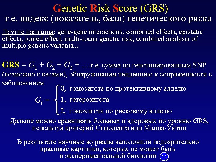 Genetic Risk Score (GRS) т. е. индекс (показатель, балл) генетического риска Другие названия: gene-gene interactions, combined effects, epistatic effects, joined effect, multi-locus genetic risk, combined analysis of multiple genetic variants. . . GRS = G 1 + G 2 + …т. е. сумма по генотипированным SNP (возможно с весами), обнаружившим тенденцию к сопряженности с заболеванием 0, гомозигота по протективному аллелю Gi = 1, гетерозигота 2, гомозигота по рисковому аллелю Дальше можно сравнивать больных и здоровых по уровню GRS, используя критерий Стьюдента или Манна-Уитни В результате научные журналы заполонили подозрительно красивые картинки, которых не может быть в экспериментальной биологии