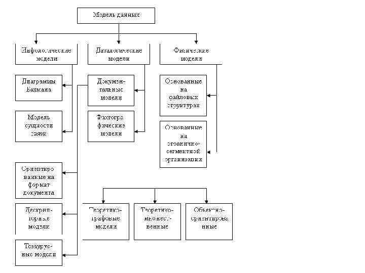 Классификация моделей данных Понятие «данные» в концепции баз данных — это набор конкретных значений, параметров, характеризующих объект, условие, ситуацию или любые другие факторы. Центральным понятием в области баз данных является понятие модели. В соответствии с трехуровневой архитектурой следует рассматривать понятие модели данных по отношению к каждому уровню. Физическая модель данных оперирует категориями, касающимися организации внешней памяти и структур хранения, используемых в данной операционной среде. В качестве физических моделей используются различные методы размещения данных, основанные на файловых структурах: это организация файлов прямого и последовательного доступа, индексных файлов, инвертированных файлов, использующих различные методы хэширования, взаимосвязанных файлов, страничная организация