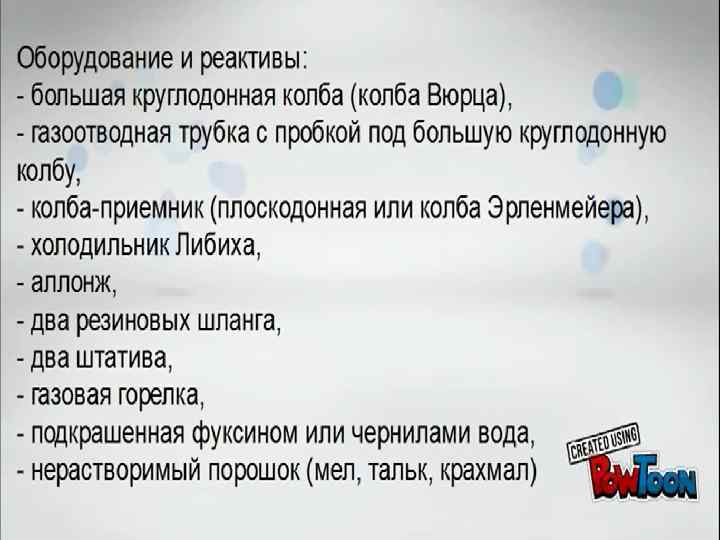 Опыт «Закипание эфира при растворении гидроксида натрия» Оборудование: пробирка, газоотводная трубка, стакан, стеклянная палочка с резиновым наконечником. Реактивы: вода, серный эфир, гидроксид натрия. Ход работы: В пробирку, снабженную пробкой с газоотводной трубкой, изогнутой наливают 2— 3 мл серного эфира. В стакан емкостью 100 мл наливают 40— 50 мл воды и осторожно всыпают около одной чайной ложки едкого натра и взбалтывают стеклянной палочкой с надетым на конце куском резиновой трубки, чтобы случайно не пробить дно стакана. В образовавшийся горячий раствор опускают пробирку с эфиром и продолжают взбалтывание. Через некоторое время эфир закипает, и пары его можно зажечь у оттянутого конца стеклянной трубки.