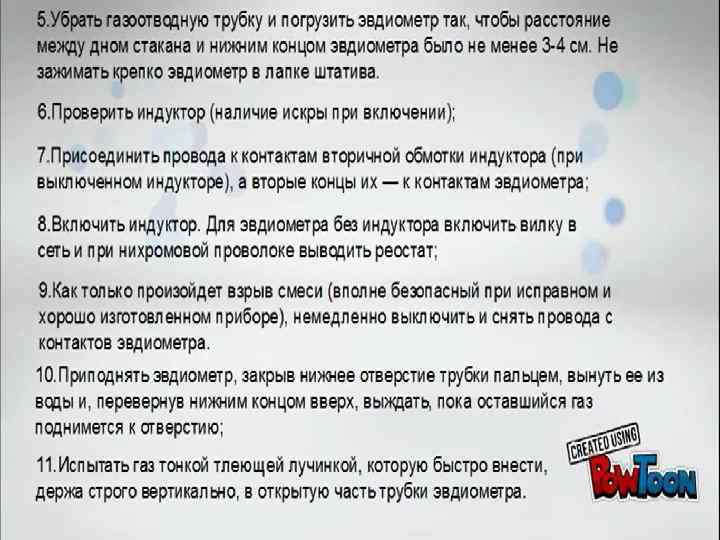 IV. Кальций Оборудование: фильтровальная бумага, напильник, марля, тигельные щипцы, цилиндр. Реактивы: кальций, вода. Ход работы: Кальций осушить фильтровальной бумагой и зачистить напильником. Завернуть кальций в марлю. Захватить тигельными щипцами и подвести под цилиндр заполненный водой. Са + 2 Н 2 О = Са(ОН)2 + Н 2 ↑