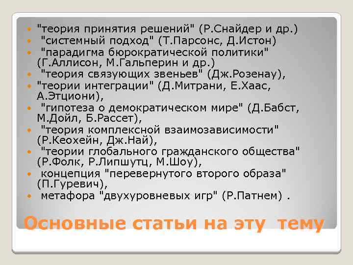 "теория принятия решений" (Р. Снайдер и др. ) "системный подход" (Т. Парсонс, Д. Истон) "парадигма бюрократической политики" (Г. Аллисон, М. Гальперин и др. ) "теория связующих звеньев" (Дж. Розенау), "теории интеграции" (Д. Митрани, Е. Хаас, А. Этциони), "гипотеза о демократическом мире" (Д. Бабст, М. Дойл, Б. Рассет), "теория комплексной взаимозависимости" (Р. Кеохейн, Дж. Най), "теории глобального гражданского общества" (Р. Фолк, Р. Липшутц, М. Шоу), концепция "перевернутого второго образа" (П. Гуревич), метафора "двухуровневых игр" (Р. Патнем). Основные статьи на эту тему