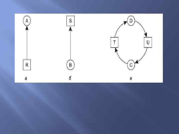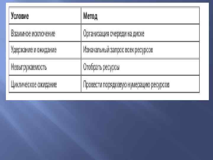 1. Условие взаимного исключения. Каждый ресурс либо выделен в данный момент только одному процессу, либо доступен. 2. Условие удержания и ожидания. Процессы, удерживающие в данный момент ранее выделенные им ресурсы, могут запрашивать новые ресурсы. 3. Условие невыгружаемости. Ранее выделенные ресурсы не могут быть принудительно отобраны у процесса. Они должны быть явным образом высвобождены тем процессом, который их удерживает. 4. Условие циклического ожидания. Должна существовать кольцевая последовательность из двух и более процессов, каждый из которых ожидает высвобождения ресурса, удерживаемого следующим членом последовательности.