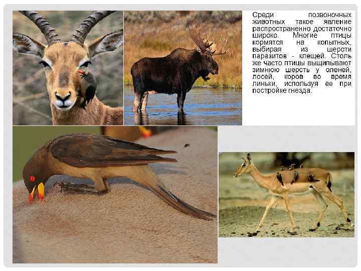 • Среди огромногообразия взаимосвязей живых существ выделяют определенные типы взаимоотношений, имеющие много общего у организмов разных систематических групп.