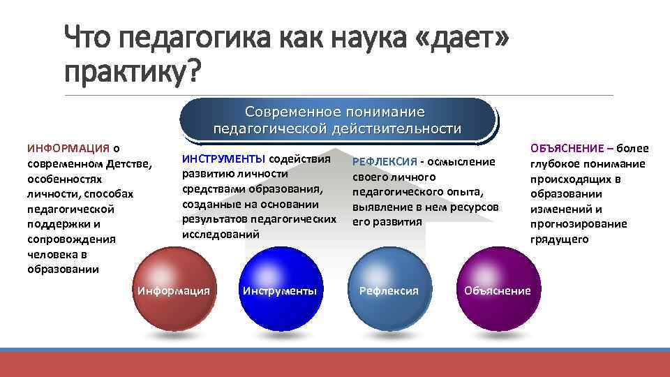 Что педагогика как наука «дает» практику? Современное понимание педагогической действительности ИНФОРМАЦИЯ о современном Детстве, особенностях личности, способах педагогической поддержки и сопровождения человека в образовании ИНСТРУМЕНТЫ содействия развитию личности средствами образования, созданные на основании результатов педагогических исследований Информация Инструменты РЕФЛЕКСИЯ - осмысление своего личного педагогического опыта, выявление в нем ресурсов его развития Рефлексия ОБЪЯСНЕНИЕ – более глубокое понимание происходящих в образовании изменений и прогнозирование грядущего Объяснение