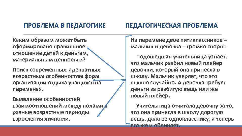 ПРОБЛЕМА В ПЕДАГОГИКЕ Каким образом может быть сформировано правильное отношение детей к деньгам, материальным ценностям? Поиск современных, адекватных возрастным особенностям форм организации отдыха учащихся на переменах. Выявление особенностей взаимоотношений между полами в разные возрастные периоды взросления личности. ПЕДАГОГИЧЕСКАЯ ПРОБЛЕМА На перемене двое пятиклассников – мальчик и девочка – громко спорят. Подошедшая учительница узнает, что мальчик разбил новый плейер девочки, который она принесла в школу. Мальчик уверяет, что это вышло случайно. А девочка требует деньги за разбитую вещь или же новый плейер. Учительница отчитала девочку за то, что она принесла в школу дорогую вещь, дала ее однокласснику, а теперь его же и обвиняет.