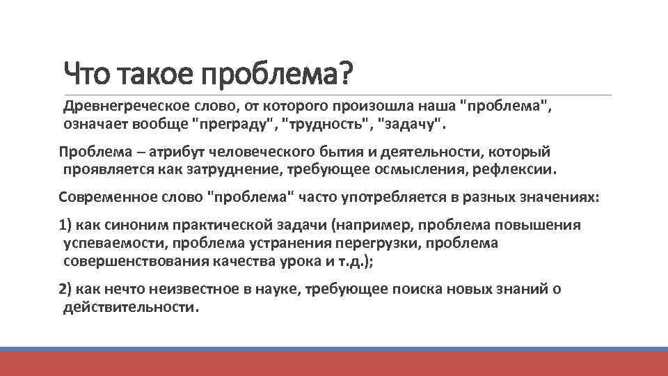 Что такое проблема? Древнегреческое слово, от которого произошла наша "проблема", означает вообще "преграду", "трудность", "задачу". Проблема – атрибут человеческого бытия и деятельности, который проявляется как затруднение, требующее осмысления, рефлексии. Современное слово "проблема" часто употребляется в разных значениях: 1) как синоним практической задачи (например, проблема повышения успеваемости, проблема устранения перегрузки, проблема совершенствования качества урока и т. д. ); 2) как нечто неизвестное в науке, требующее поиска новых знаний о действительности.