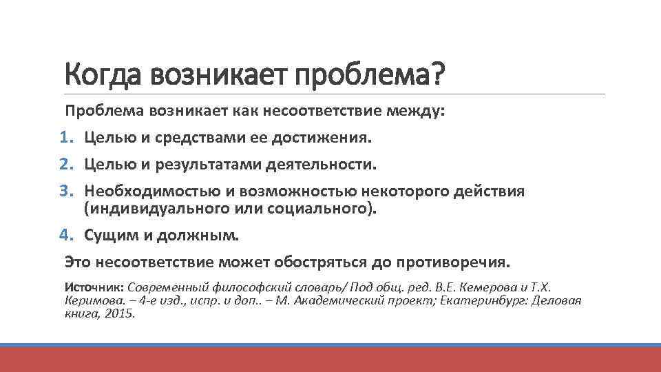 Когда возникает проблема? Проблема возникает как несоответствие между: 1. Целью и средствами ее достижения. 2. Целью и результатами деятельности. 3. Необходимостью и возможностью некоторого действия (индивидуального или социального). 4. Сущим и должным. Это несоответствие может обостряться до противоречия. Источник: Современный философский словарь/ Под общ. ред. В. Е. Кемерова и Т. Х. Керимова. – 4 -е изд. , испр. и доп. . – М. Академический проект; Екатеринбург: Деловая книга, 2015.