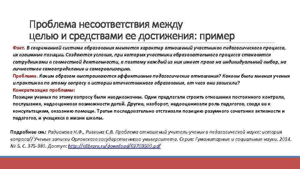 Проблема несоответствия между целью и средствами ее достижения: пример Факт. В современной системе образования меняется характер отношений участников педагогического процесса, их взаимные позиции. Создаются условия, при которых участники образовательного процесса становятся сотрудниками в совместной деятельности, а поэтому каждый из них имеет право на индивидуальный выбор, на личностное самоопределение и самореализацию. Проблема. Каким образом выстраиваются эффективные педагогические отношения? Каковы были мнения ученых и практиков по этому вопросу в истории отечественного образования, от чего они зависели? Конкретизация проблемы: Позиции ученых по этому вопросу были неоднозначны. Одни предлагали строить отношения постоянного контроля, послушания, недооценивая возможности детей. Другие, наоборот, недооценивали роль педагогов, сводя ее к консультациям, оказанию помощи. Третьи последовательно отстаивали позицию разумного сочетания активности и педагогов, и учащихся в жизни школы. Подробнее см. : Радионова Н. Ф. , Ривкина С. В. Проблема отношений учитель-ученик в педагогической науке: история вопроса// Ученые записки Орловского государственного университета. Серия: Гуманитарные и социальные науки. 2014. № 5. С. 375 -380. Доступ: http: //elibrary. ru/download/69703500. pdf