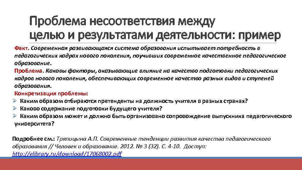 Проблема несоответствия между целью и результатами деятельности: пример Факт. Современная развивающаяся система образования испытывает потребность в педагогических кадрах нового поколения, поучивших современное качественное педагогическое образование. Проблема. Каковы факторы, оказывающие влияние на качество подготовки педагогических кадров нового поколения, обеспечивающих современное качество разных видов и ступеней образования. Конкретизация проблемы: Ø Каким образом отбираются претенденты на должность учителя в разных странах? Ø Каково содержание подготовки будущего учителя? Ø Каким образом может и должно быть организовано сопровождение выпускника педагогического университета? Подробнее см. : Тряпицына А. П. Современные тенденции развития качества педагогического образования // Человек и образование. 2012. № 3 (32). С. 4 -10. Доступ: http: //elibrary. ru/download/17068002. pdf