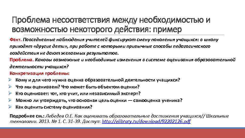 Проблема несоответствия между необходимостью и возможностью некоторого действия: пример Факт. Повседневные наблюдения учителей фиксируют смену поколения учащихся: в школу приходят «другие дети» , при работе с которыми привычные способы педагогического воздействия не дают желаемых результатов. Проблема. Каковы возможные и необходимые изменения в системе оценивания образовательной деятельности учащихся? Конкретизация проблемы: Ø Кому и для чего нужна оценка образовательной деятельности учащихся? Ø Что мы оцениваем? Что может быть объектом оценки? Ø Кто оценивает: тот, кто учит, или независимый эксперт? Ø Можно ли утверждать, что основная цель оценки — самооценка ученика? Ø Как оценить систему оценивания? Подробнее см. : Лебедев О. Е. Как оценивать образовательные достижения учащихся// Школьные технологии. 2013. № 1. С. 31 -39. Доступ: http: //elibrary. ru/download/92202126. pdf