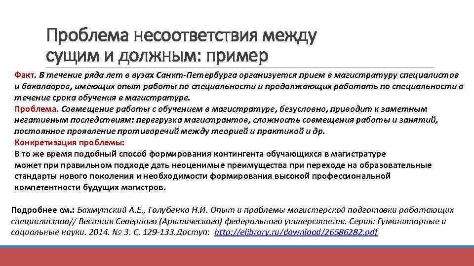 Проблема несоответствия между сущим и должным: пример Факт. В течение ряда лет в вузах Санкт-Петербурга организуется прием в магистратуру специалистов и бакалавров, имеющих опыт работы по специальности и продолжающих работать по специальности в течение срока обучения в магистратуре. Проблема. Совмещение работы с обучением в магистратуре, безусловно, приводит к заметным негативным последствиям: перегрузка магистрантов, сложность совмещения работы и занятий, постоянное проявление противоречий между теорией и практикой и др. Конкретизация проблемы: В то же время подобный способ формирования контингента обучающихся в магистратуре может при правильном подходе дать неоценимые преимущества при переходе на образовательные стандарты нового поколения и необходимости формирования высокой профессиональной компетентности будущих магистров. Подробнее см. : Бахмутский А. Е. , Голубенко Н. И. Опыт и проблемы магистерской подготовки работающих специалистов// Вестник Северного (Арктического) федерального университета. Серия: Гуманитарные и социальные науки. 2014. № 3. С. 129 -133. Доступ: http: //elibrary. ru/download/26586282. pdf