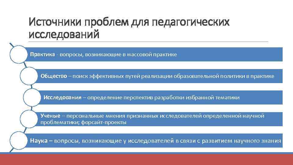 Источники проблем для педагогических исследований Практика - вопросы, возникающие в массовой практике Практика Общество – поиск эффективных путей реализации образовательной политики в практике Исследования – определение перспектив разработки избранной тематики Ученые – персональные мнения признанных исследователей определенной научной Ученые проблематики; форсайт-проекты Наука – вопросы, возникающие у исследователей в связи с развитием научного знания Наука