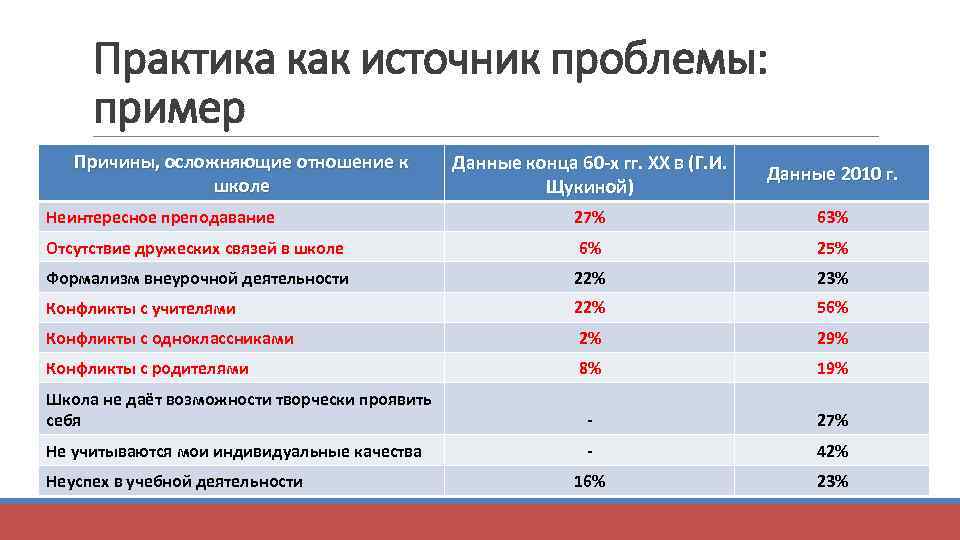 Практика как источник проблемы: пример Причины, осложняющие отношение к школе Данные конца 60 -х гг. ХХ в (Г. И. Щукиной) Данные 2010 г. Неинтересное преподавание 27% 63% Отсутствие дружеских связей в школе 6% 25% Формализм внеурочной деятельности 22% 23% Конфликты с учителями 22% 56% Конфликты с одноклассниками 2% 29% Конфликты с родителями 8% 19% Школа не даёт возможности творчески проявить себя - 27% Не учитываются мои индивидуальные качества - 42% 16% 23% Неуспех в учебной деятельности
