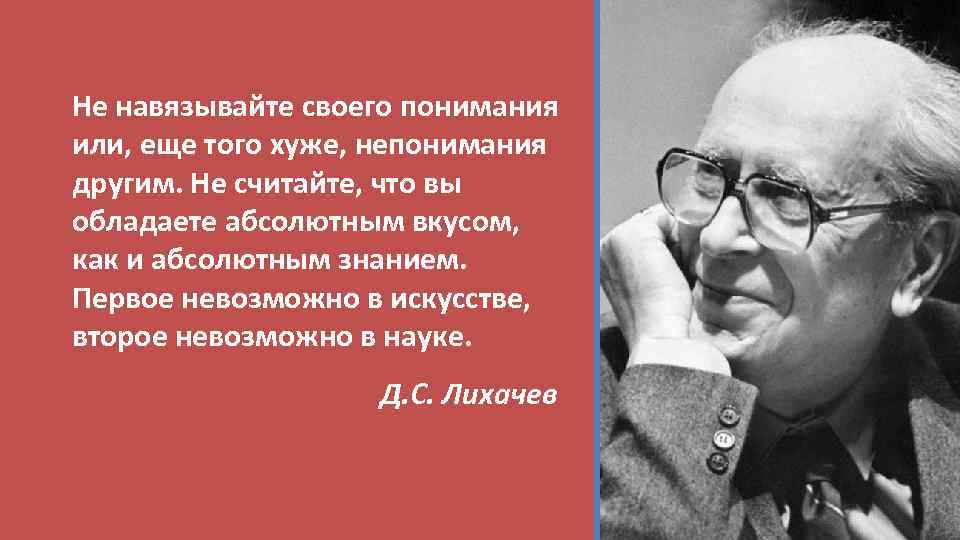 Не навязывайте своего понимания или, еще того хуже, непонимания другим. Не считайте, что вы обладаете абсолютным вкусом, как и абсолютным знанием. Первое невозможно в искусстве, второе невозможно в науке. Д. С. Лихачев
