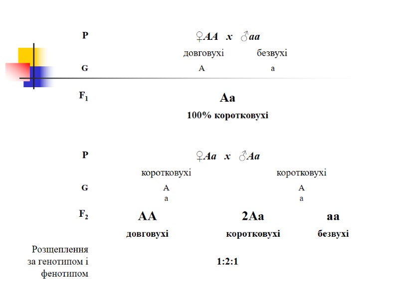 Успадкування форми вушної раковини у овець (А – довговухі, а – безвухі, Аа – коротковухі)