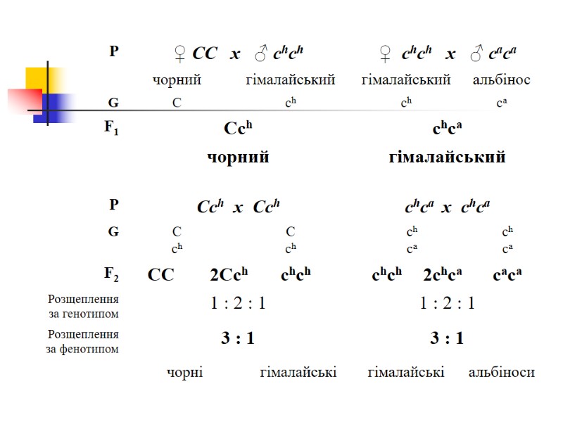 P ♀ АаВв x ♂ АаВв агуті агуті Розщеплення в F2 за фенотипом: 9 : 3 : 4: 9/16 (агуті) – мають у генотипі хоча б по одному домінантному гену (А та В) з кожної пари; 3/16 (чорні) – мають ген А, який відповідає за присутність пігменту та гомозиготний рецесивний генотип за генами в (вв), який визначає рівномірний розподіл пігменту по волосині; 4/16 (білі) – мають гомозиготний рецесивний генотип за геном альбінізму (аа).