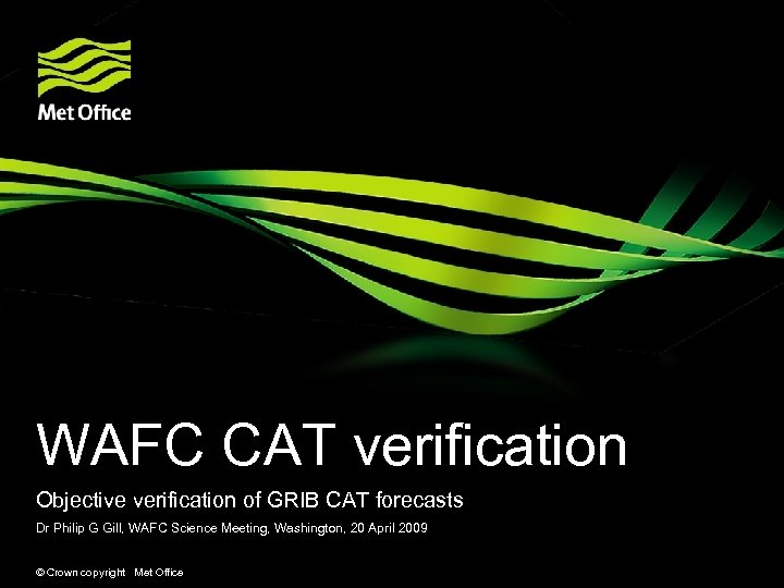 WAFC CAT verification Objective verification of GRIB CAT forecasts Dr Philip G Gill, WAFC Science Meeting, Washington, 20 April 2009 © Crown copyright Met Office