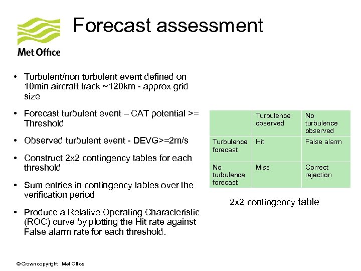 Forecast assessment • Turbulent/non turbulent event defined on 10 min aircraft track ~120 km - approx grid size • Forecast turbulent event – CAT potential >= Threshold • Observed turbulent event - DEVG>=2 m/s • Construct 2 x 2 contingency tables for each threshold • Sum entries in contingency tables over the verification period • Produce a Relative Operating Characteristic (ROC) curve by plotting the Hit rate against False alarm rate for each threshold. © Crown copyright Met Office Turbulence observed No turbulence observed Turbulence forecast Hit False alarm No turbulence forecast Miss Correct rejection 2 x 2 contingency table