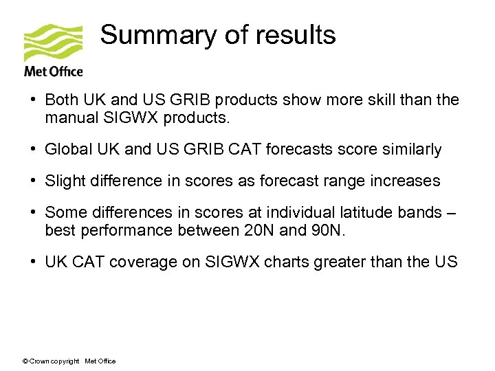 Summary of results • Both UK and US GRIB products show more skill than the manual SIGWX products. • Global UK and US GRIB CAT forecasts score similarly • Slight difference in scores as forecast range increases • Some differences in scores at individual latitude bands – best performance between 20 N and 90 N. • UK CAT coverage on SIGWX charts greater than the US © Crown copyright Met Office