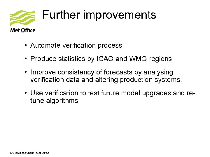 Further improvements • Automate verification process • Produce statistics by ICAO and WMO regions • Improve consistency of forecasts by analysing verification data and altering production systems. • Use verification to test future model upgrades and retune algorithms © Crown copyright Met Office