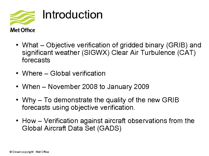 Introduction • What – Objective verification of gridded binary (GRIB) and significant weather (SIGWX) Clear Air Turbulence (CAT) forecasts • Where – Global verification • When – November 2008 to January 2009 • Why – To demonstrate the quality of the new GRIB forecasts using objective verification. • How – Verification against aircraft observations from the Global Aircraft Data Set (GADS) © Crown copyright Met Office