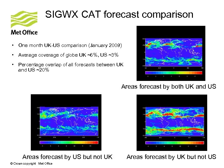 SIGWX CAT forecast comparison • One month UK-US comparison (January 2009) • Average coverage of globe UK ~6%, US ~3% • Percentage overlap of all forecasts between UK and US ~20% Areas forecast by both UK and US Areas forecast by US but not UK © Crown copyright Met Office Areas forecast by UK but not US