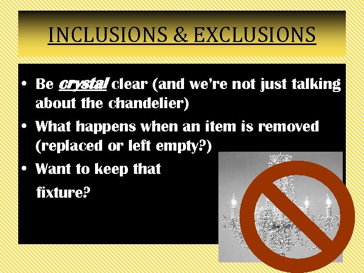 INCLUSIONS & EXCLUSIONS • Be crystal clear (and we’re not just talking about the chandelier) • What happens when an item is removed (replaced or left empty? ) • Want to keep that fixture?