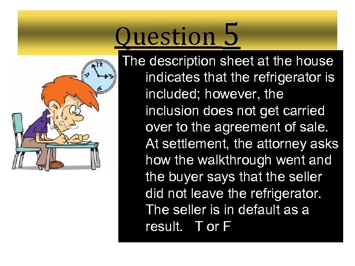 Question 5 The description sheet at the house indicates that the refrigerator is included; however, the inclusion does not get carried over to the agreement of sale. At settlement, the attorney asks how the walkthrough went and the buyer says that the seller did not leave the refrigerator. The seller is in default as a result. T or F