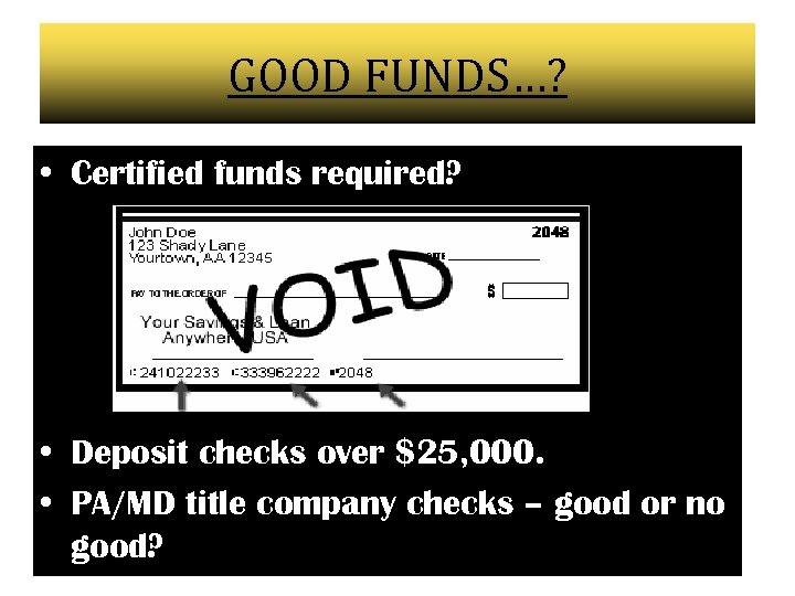 GOOD FUNDS…? • Certified funds required? • Deposit checks over $25, 000. • PA/MD title company checks – good or no good?