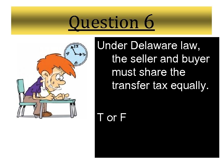 Question 6 Under Delaware law, the seller and buyer must share the transfer tax equally. T or F