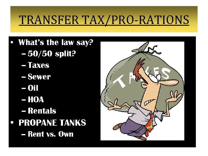 TRANSFER TAX/PRO-RATIONS • What’s the law say? – 50/50 split? – Taxes – Sewer – Oil – HOA – Rentals • PROPANE TANKS – Rent vs. Own