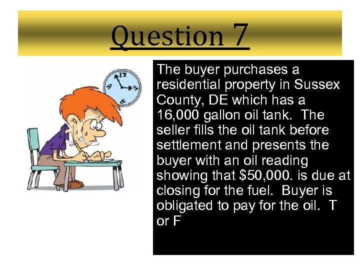 Question 7 The buyer purchases a residential property in Sussex County, DE which has a 16, 000 gallon oil tank. The seller fills the oil tank before settlement and presents the buyer with an oil reading showing that $50, 000. is due at closing for the fuel. Buyer is obligated to pay for the oil. T or F