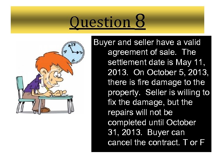 Question 8 Buyer and seller have a valid agreement of sale. The settlement date is May 11, 2013. On October 5, 2013, there is fire damage to the property. Seller is willing to fix the damage, but the repairs will not be completed until October 31, 2013. Buyer cancel the contract. T or F