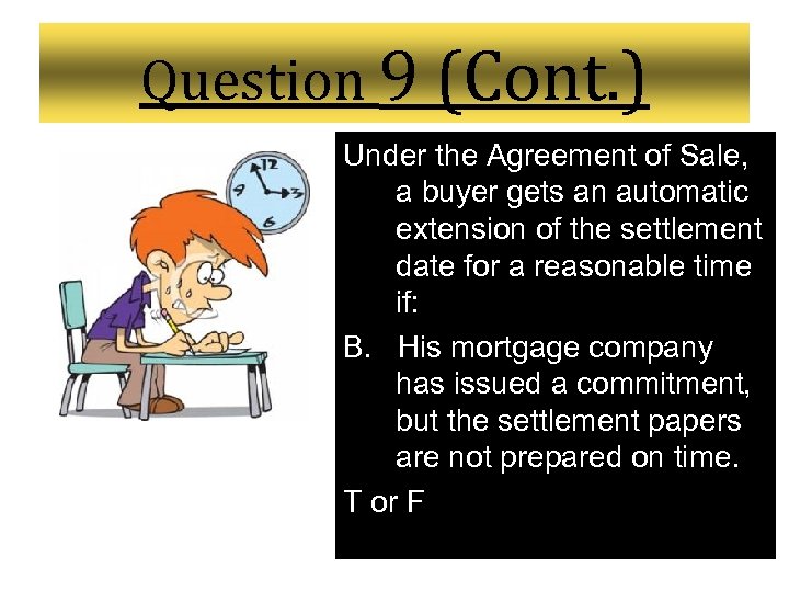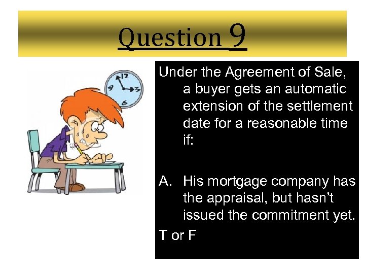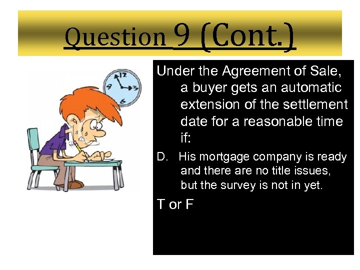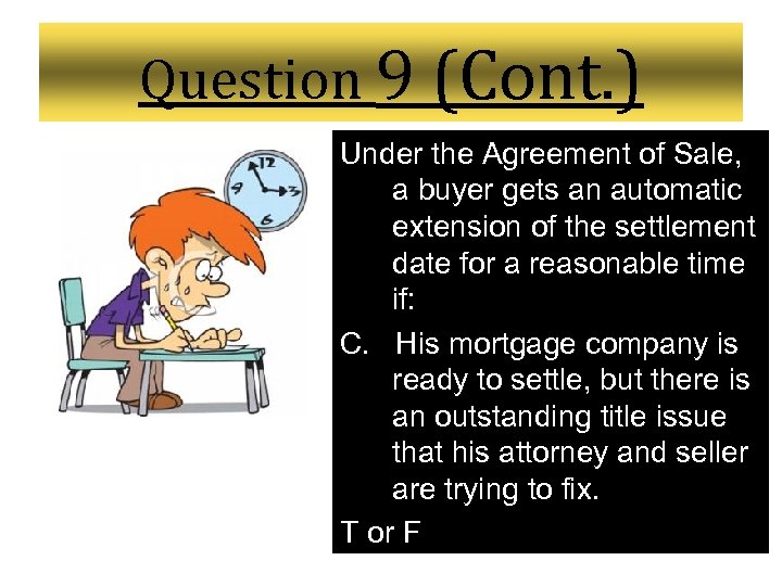 Question 9 (Cont. ) Under the Agreement of Sale, a buyer gets an automatic extension of the settlement date for a reasonable time if: C. His mortgage company is ready to settle, but there is an outstanding title issue that his attorney and seller are trying to fix. T or F