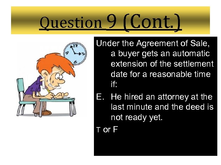Question 9 (Cont. ) Under the Agreement of Sale, a buyer gets an automatic extension of the settlement date for a reasonable time if: E. He hired an attorney at the last minute and the deed is not ready yet. T or F