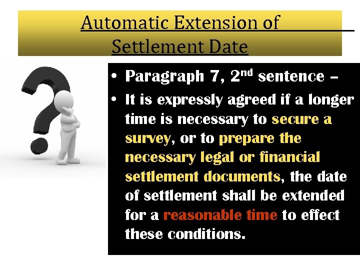 Automatic Extension of Settlement Date • Paragraph 7, 2 nd sentence – • It is expressly agreed if a longer time is necessary to secure a survey, or to prepare the necessary legal or financial settlement documents, the date of settlement shall be extended for a reasonable time to effect these conditions.