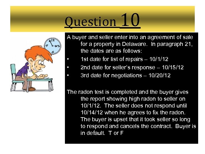 Question 10 A buyer and seller enter into an agreement of sale for a property in Delaware. In paragraph 21, the dates are as follows: • 1 st date for list of repairs – 10/1/12 • 2 nd date for seller’s response – 10/15/12 • 3 rd date for negotiations – 10/20/12 The radon test is completed and the buyer gives the report showing high radon to seller on 10/1/12. The seller does not respond until 10/14/12 when he agrees to fix the radon. The buyer is upset that it took seller so long to respond and cancels the contract. Buyer is in default. T or F