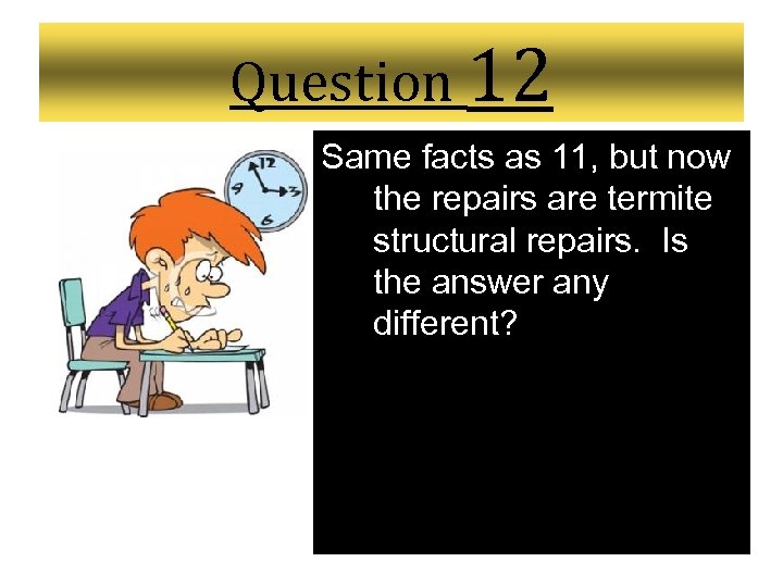 Question 12 Same facts as 11, but now the repairs are termite structural repairs. Is the answer any different?