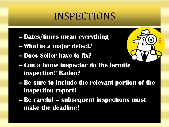 INSPECTIONS – Dates/times mean everything – What is a major defect? – Does Seller have to fix? – Can a home inspector do the termite inspection? Radon? – Be sure to include the relevant portion of the inspection report! – Be careful – subsequent inspections must make the deadline!