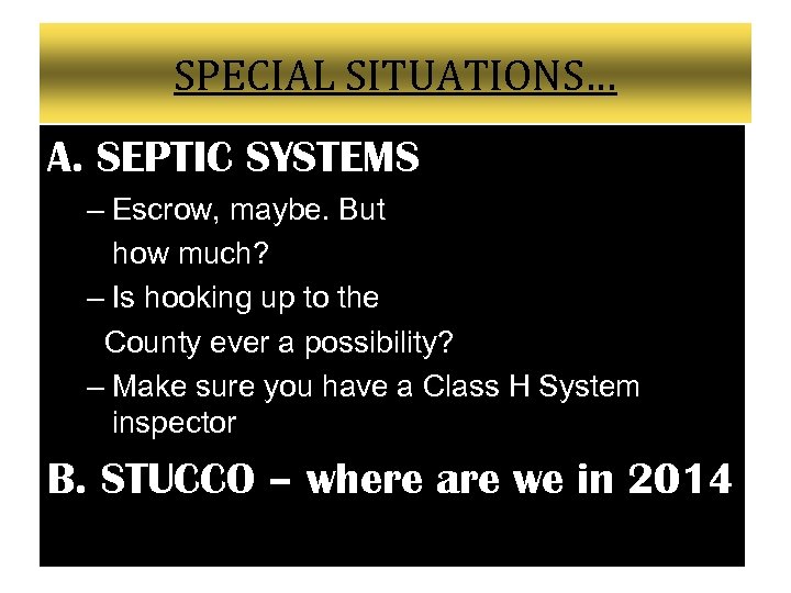 SPECIAL SITUATIONS… A. SEPTIC SYSTEMS – Escrow, maybe. But how much? – Is hooking up to the County ever a possibility? – Make sure you have a Class H System inspector B. STUCCO – where are we in 2014