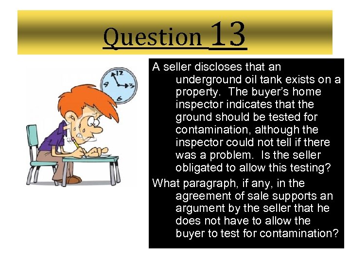 Question 13 A seller discloses that an underground oil tank exists on a property. The buyer’s home inspector indicates that the ground should be tested for contamination, although the inspector could not tell if there was a problem. Is the seller obligated to allow this testing? What paragraph, if any, in the agreement of sale supports an argument by the seller that he does not have to allow the buyer to test for contamination?