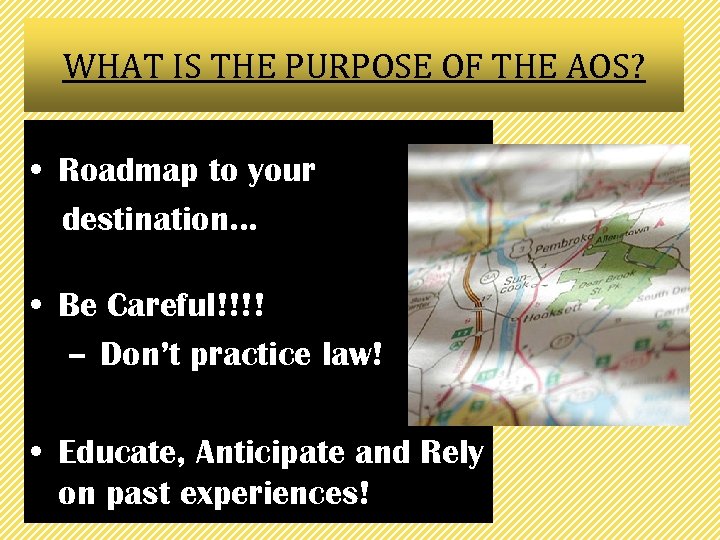 WHAT IS THE PURPOSE OF THE AOS? • Roadmap to your destination… • Be Careful!!!! – Don’t practice law! • Educate, Anticipate and Rely on past experiences!