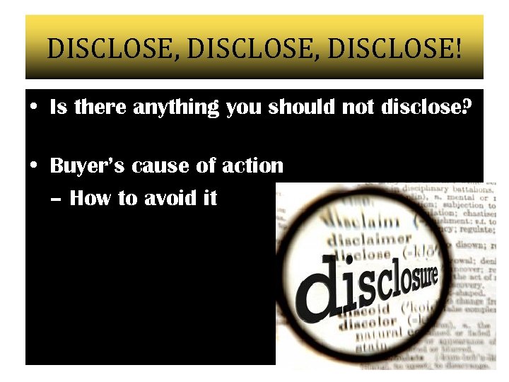 DISCLOSE, DISCLOSE! • Is there anything you should not disclose? • Buyer’s cause of action – How to avoid it