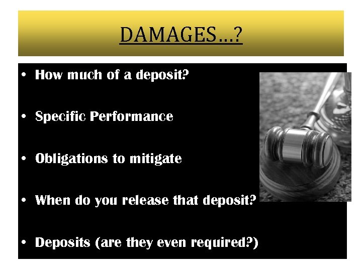 DAMAGES…? • How much of a deposit? • Specific Performance • Obligations to mitigate • When do you release that deposit? • Deposits (are they even required? )