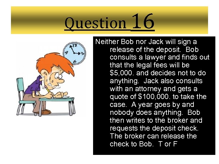 Question 16 Neither Bob nor Jack will sign a release of the deposit. Bob consults a lawyer and finds out that the legal fees will be $5, 000. and decides not to do anything. Jack also consults with an attorney and gets a quote of $100, 000. to take the case. A year goes by and nobody does anything. Bob then writes to the broker and requests the deposit check. The broker can release the check to Bob. T or F